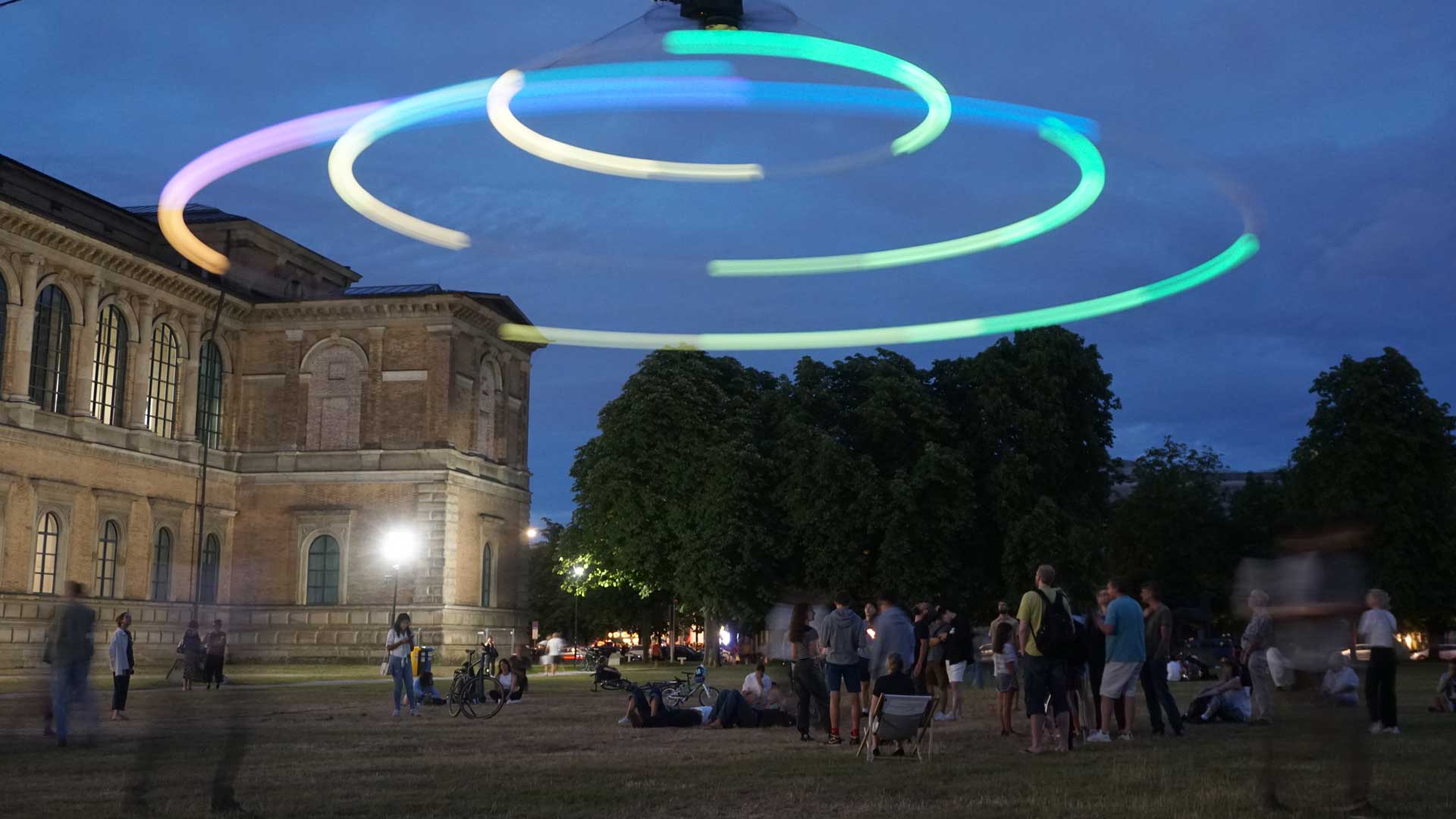 Klangrevolution Das Heaven's Carousel versetzt ein ganzes Ensemble aus 36 leuchtenden Klangkörpern auf sprichwörtlich revolutionäre Weise in Bewegung. Die karusselartige kinetische Klangskulptur schwebt in 10 Metern Höhe an einem Anhängerkran: In Rotation versetzt drehen sich die illuminierten kugelförmigen Lautsprecher, die auf drei ringförmigen Ebenen angeordnet sind, wie Himmelskörper mit einer Spannweite von bis zu 16 Metern auf kreisförmigen Bahnen – den Revolutionen – über den Köpfen der Besucher:innen. Eine Einladung, die positionsabhängigen Veränderungen des vibrierenden Klanguniversum aktiv zu erkunden.