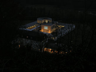Das kann man genau sagen. Für mich war es überraschend. Bei dem Wettbewerb gab es eine große Gruppendynamik. Es war für mich faszinierend zu beobachten, wie die fünf oder sechs Fachpreisrichter und fünf Sachpreisrichter einen Tag lang von morgens bis abends gerungen haben über diese 33 Entwürfe. Am Ende waren alle einhellig der Meinung war: das ist der Entwurf. Also das war der eindeutige Sieger. Der ausschlaggebende Punkt war, daß die Jury meinte, der Entwurf habe eine Seele und verkörpere, was hier getrieben werden soll. Die Funktionsbauten sind von einem Quadrat von Zellen umgeben, wo die Leute sich in die Landschaft ergießen können und ihre Seelen öffnen können, wenn sie hier raus kommen. Man öffnet sich also zur Landschaft, wenn man den funktionalen Bau in der Mitte verläßt. Man geht in sein Zimmer, kuckt aus dem Fenster und ist in einer wunderschönen Landschaft. Gleichzeitig hält dieses Quadrat mit den Wissenschaftlerzellen die Funktion in der Mitte bestehend aus dem Hörsaalwürfel und dem Bibliothekszylinder zusammen. Das haben die Architekten in ihrer Beschreibung auch sehr gut dargestellt. Die Jury hat ihnen das abgekauft und es zeigt sich tatsächlich hier im alltäglichen Betrieb, daß der Bau funktioniert. |
