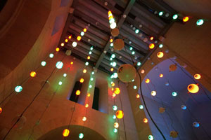 A special interplay between near and far was performed by means of a large projection measuring no less than 40 meters in occasion of the International Gemstone Trade Fair held at Idar-Oberstein. In the barocco cycle the world of gemstonce were approached by capturing in a private gemstone collection the shadows of the precious stones on light sensitive slide film. Finally the shadow pictures were projected on the façade of the the 80m high monolith of the German Diamonds and Gemstone Bourse, thus causing arts and architecture to enter into a baroque-like dialogue of surfaces. -