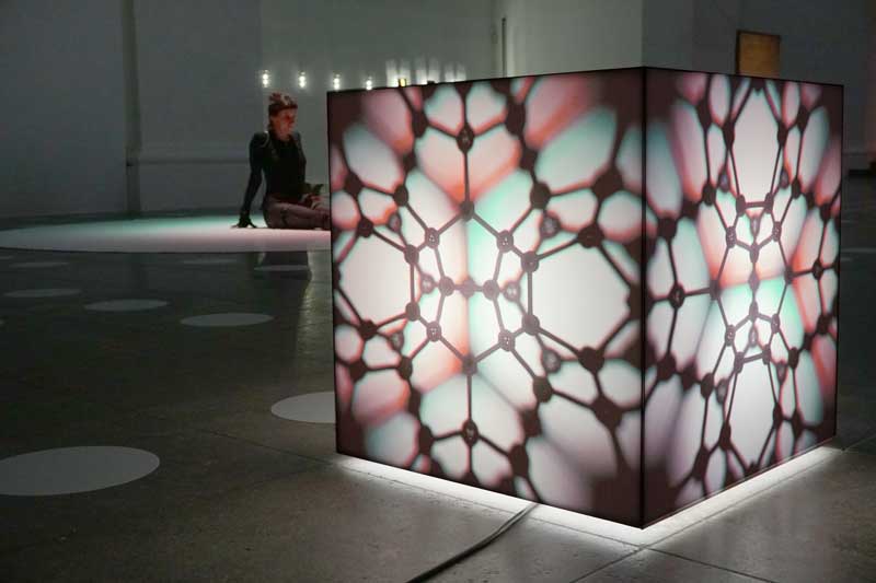 Hypershadow (2019) Tim Otto Roth takes the inversion of space to the extreme with a luminous cube sculpture. It is a kind of matryoshka game of dimensions: the luminous walls of the cube reveal the anaglyphic shadows cast by a geometric body inside the cube, which is illuminated from the centre. However, this body is literally a shadow of its former self, as it is the projection of a four-dimensional body. A simple cube shape is transformed into a hyperdimensional shadow sculpture.