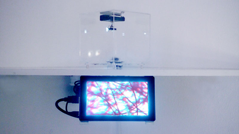 Drôle de l'ombre (2017/19) The Volx-TV on which this work is based originated from an idea by Jördis Drawe and Uwe Schüler: A mini shadow theatre in which a small, self-selected object rotates on a 'stage', illuminated from behind by an LED, casting its shadow onto the front screen. Tim Otto Roth hacked this DIY set and replaced the light sources with two LEDs in red and blue.