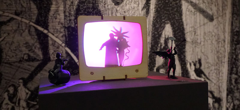 For the exhibition Schatten im Blick? (Shadows in View?) at the Wallraf-Richartz Museum, the work enters into dialogue as Drôle de l'Ombre with the copperplate engraving of Plato's allegory of the cave by Jan Saenredam from 1608, displayed opposite. The bizarre figures from Ovid's Metamorphoses, who have obviously lost their way in the cave and cast their peculiar shadows there, were remodelled as small figures. Now they make their rounds in the miniature shadow theatre.